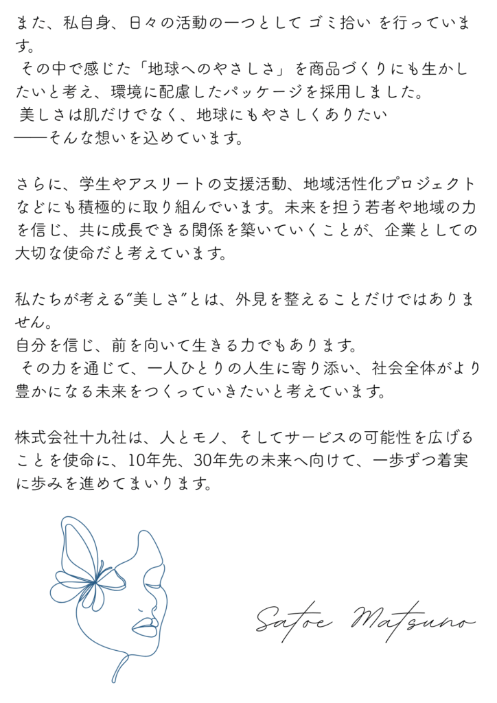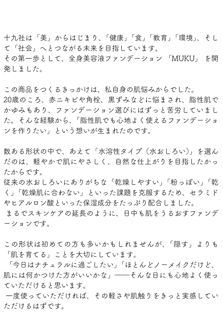 MUKUは、単なる化粧品ではありません。この製品を手にしたその瞬間から、お客様と十九社が「人にやさしく、地球にやさしい」活動を共にする、未来へのメッセージなのです。
